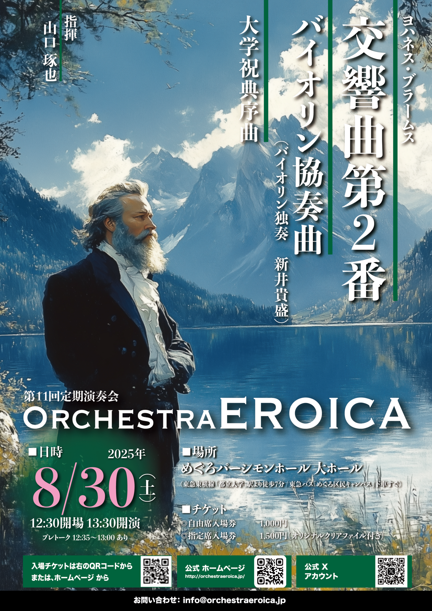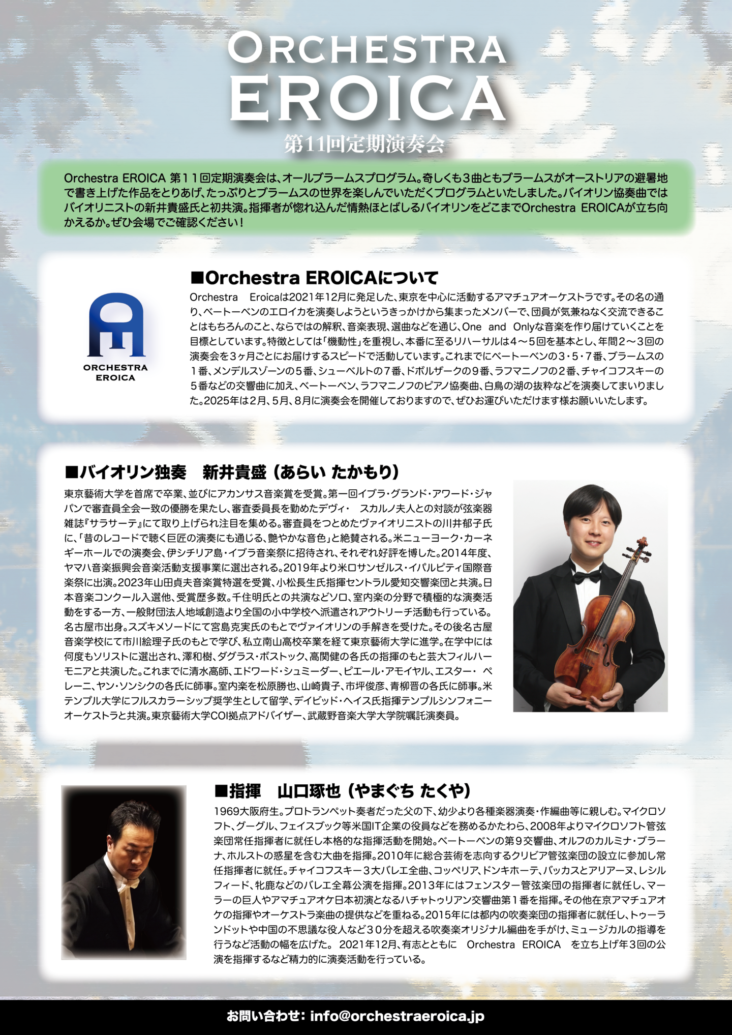 Orchestra EROICA第11回定期演奏会は、初のオールブラームスプログラムをお届けしました。大学から授与された名誉博士号の返礼として書かれ、ドイツの学生歌をたくさん盛り込んだ「大学祝典序曲」、そしてバイオリニスト新井貴盛氏との共演でお届けする名曲、バイオリン協奏曲。そして苦労して完成させた交響曲第1番の重荷が外れ、短期間に書き上げたと言われる交響曲第2番の組み合わせ。初共演の新井氏の艶やかな音色が響く記念すべき演奏会となりました。
