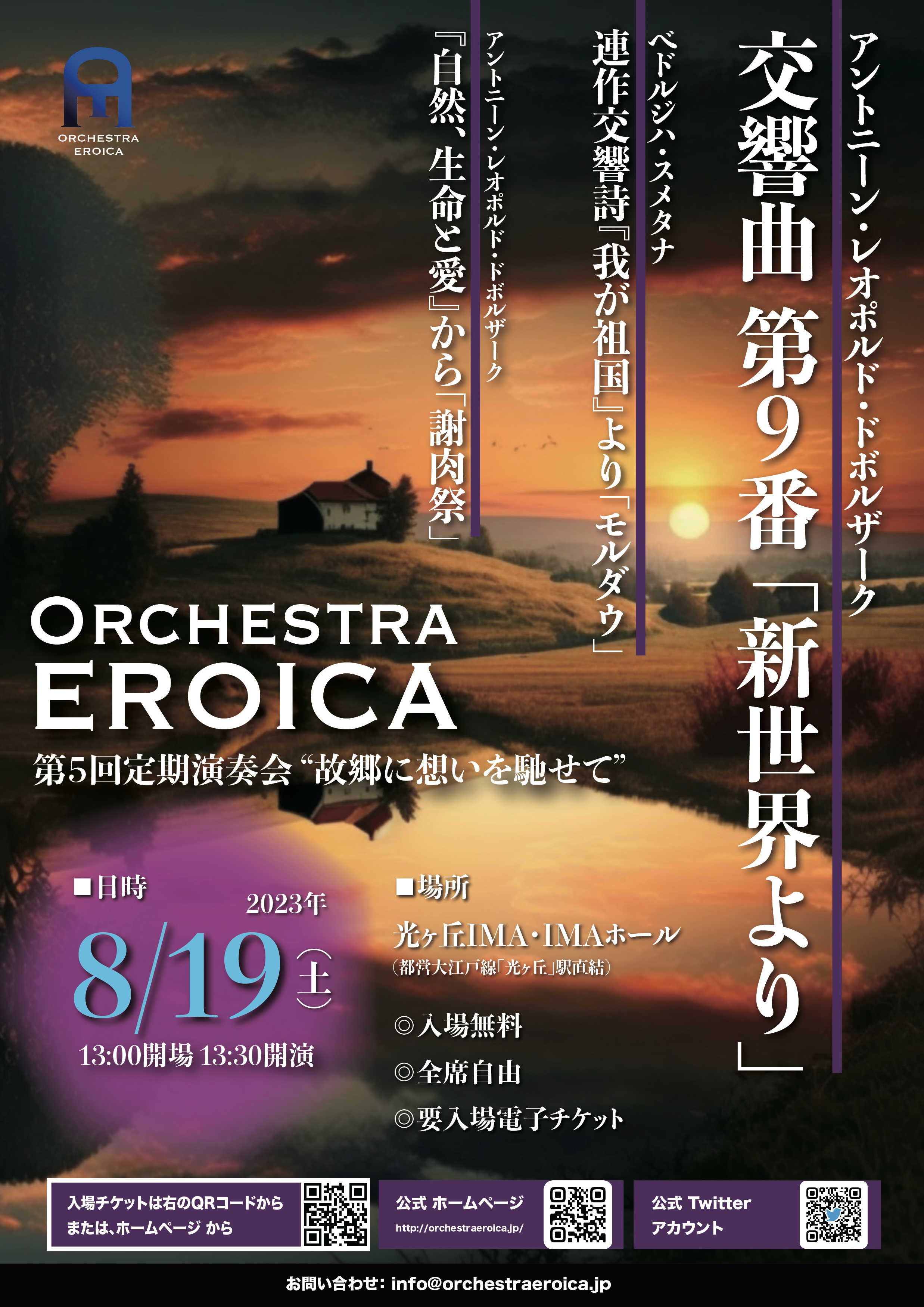 第5回演奏会はチェコの代表的な作曲家であるアントニン・ドボルザークと、ベドルジハ・スメタナの作品を取り上げました。華やかな謝肉祭、誰もが知る名曲モルダウ、そしてアメリカの先住民族音楽とチェコを想う思いを融合させた新世界。エロオケのカラフルなサウンドでお送りしました。