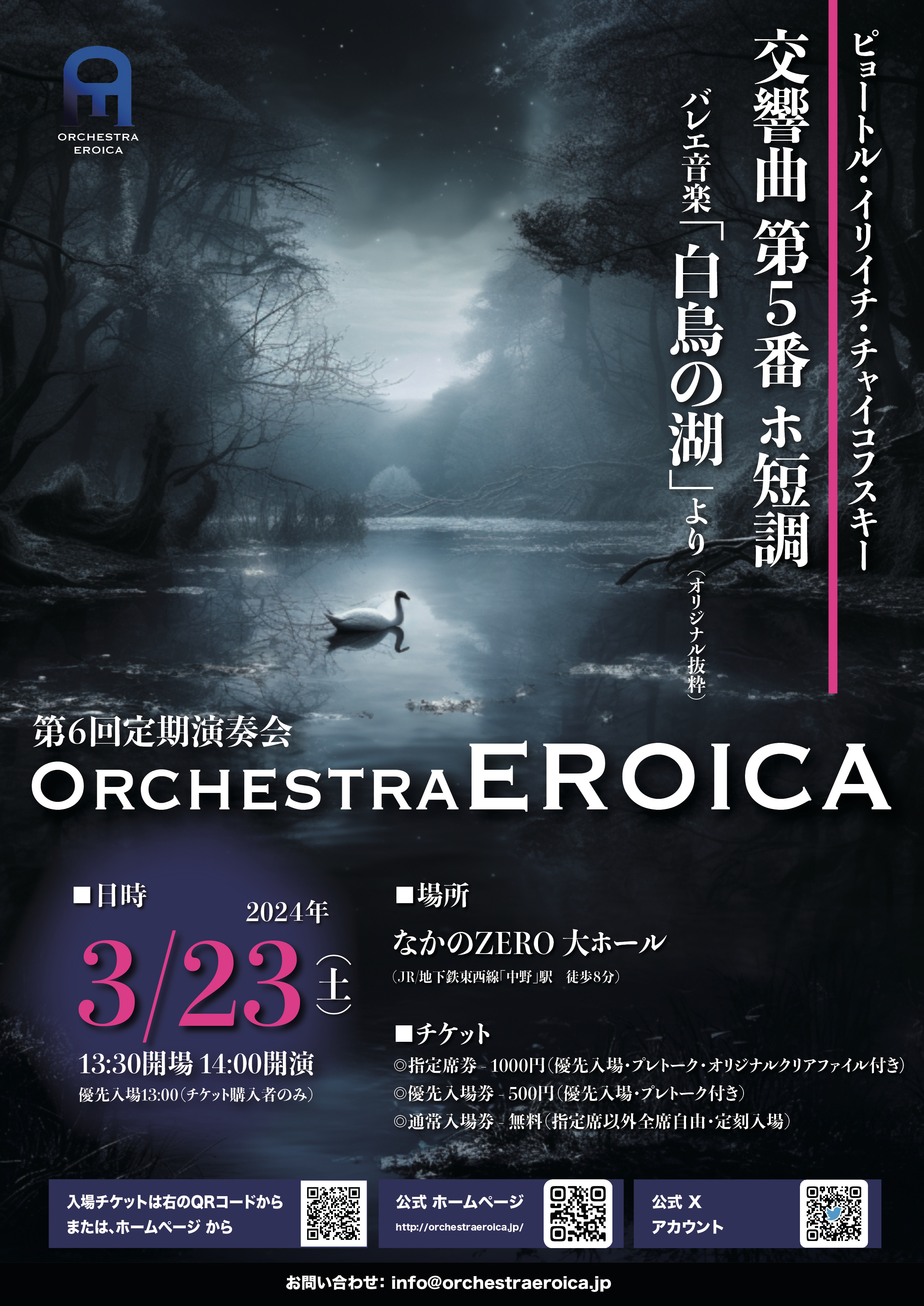 第6回定期演奏会では、オーケストラエロイカ初となる、チャイコフスキーの名曲を取り上げました。はじめは、バレエ音楽を本格的な芸術の域に変貌させたチャイコフスキーの3大バレエの中でも特にそのドラマティックな展開で人気の「白鳥の湖」。物悲しいメロディーや各国の踊り、悪魔との戦いから愛の成就と珠玉の音楽が散りばめられており、Orchestra EROICAによるオリジナル抜粋でお送りしました。メインにはチャイコフスキーの交響曲の中でも最も人気が高い、交響曲第5番ホ短調。暗く打ちひしがれたメロディーから、最後は輝かしい勝利のサウンドに至る、チャイコフスキーの絶頂期に描かれた楽曲です。Orchestra EROICAならではのチャイコフスキーへの深い敬愛をもって表現することができてましたでしょうか。