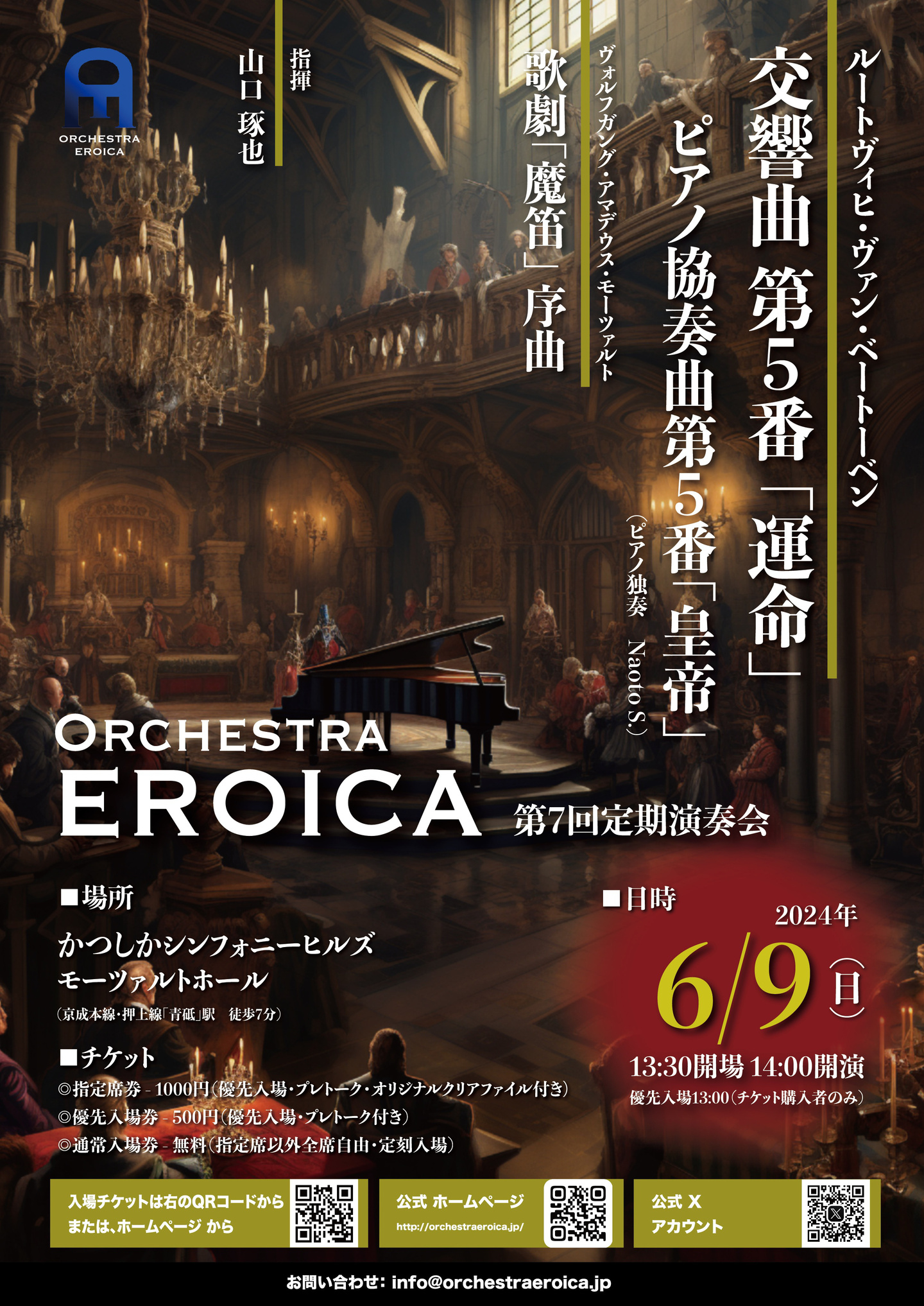 Orchestra EROICA第7回演奏会では、Orchestra EROICAのベートーベンシリーズ第3弾として、交響曲第5番「運命」、ならびにピアノ協奏曲第5番「皇帝」を取り上げました。ソリストは、ラフマニノフのピアノ協奏曲第2番で共演しご好評を頂戴したNaoto S.氏。お互いを知ったタッグでお届けすることができました。オープニングはモーツァルトの歌劇「魔笛」序曲。モーツァルトの遊び心を表現できていれば幸いです。