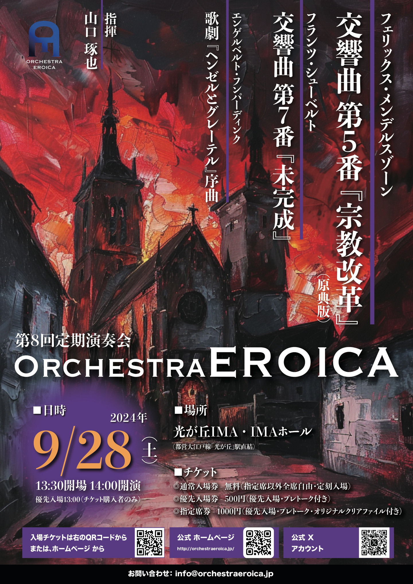 Orchestra EROICA第8回演奏会は、2024年の「5番」チクルスを締めくくる、メンデルスゾーンの交響曲第5番「宗教改革」を取り上げました。シューベルトの「未完成交響曲」、そしてフンパーディンクのメルヘンあふれる歌劇「ヘンゼルとグレーテル」の序曲とともに、ドイツ・オーストリアの作曲家の作品によるプログラム。特に「宗教改革」では作曲時19歳だったメンデルスゾーンの目線に合わせた演奏に挑戦しました。