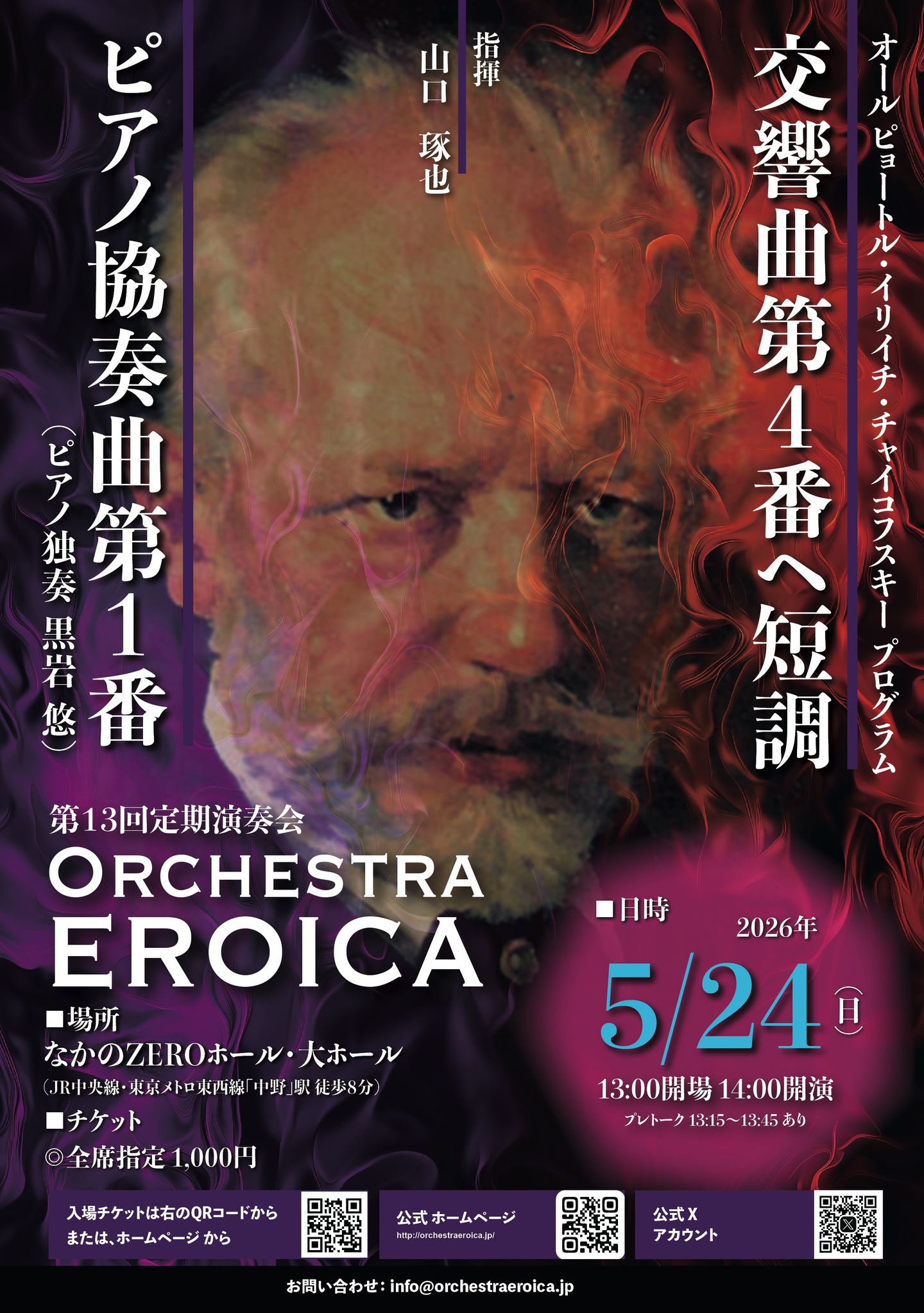 Orchestra EROICA 第13回定期演奏会は、オールチャイコフスキープログラム。創作時期が近い中でチャイコフスキーの才能が花開いていった2作品を取り上げます。ピアノ協奏曲のソリストには初共演となる黒岩悠氏をお迎えしてお送りします。また、交響曲第4番は、ロシア音楽をこよなく愛する指揮者の本領発揮となるでしょうか。熱い演奏をお届けしますので、ぜひ会場でお楽しみください!